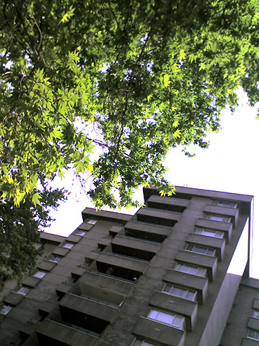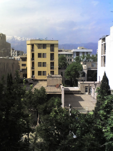 Spring is in full effect and the green leaves stand out in a background of gray buildings and a smoggy city. A building in Valiasr Street near Saee Park. |