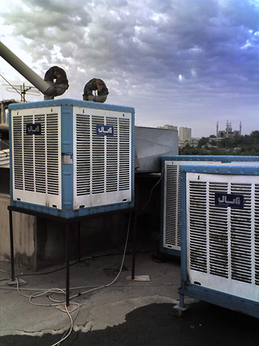 An Iranian "cooler" on the roof. It seems like a primitive air conditioning system; a fan blows air over a surface of water and shoots it down the vent. But its highly efficient and very effective. Getting ready for a hot summer ahead. |