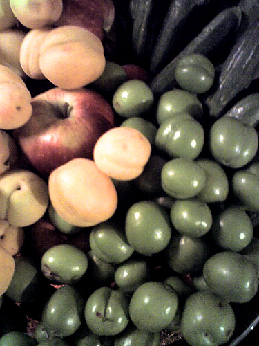 The current basket of fruits that is put in front of you at every Persian household contains such tasty seasonal fruits as "gojeh sabz" (green plums) and "zard alou" (apricot). |