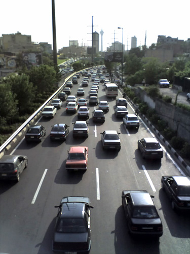 A not-so-busy afternoon on Westbound Hemmat Freeway. I would say about 50% of the cars in Tehran are Iranian-assembled French cars like Peugeot 206 and 405. Another 40% are Iranian-made South Korean Kias. |