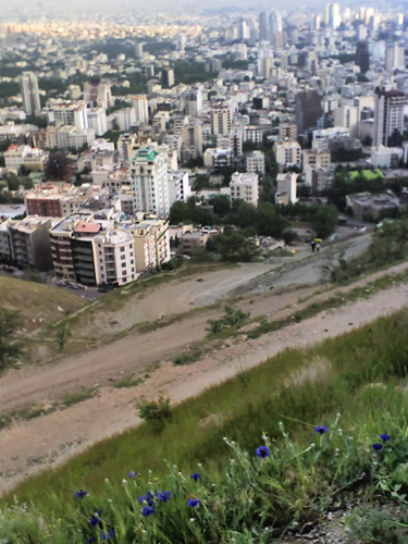 Best activity for writing partners is to go on hikes; it gets your brain working better. Specially when you are above the city. Another view of Tehran from Velenjak, with purple flowers in the foreground. |