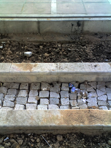 The new sidewalks of Valiasr street are part of the plan to "beautify" the city. Nothing beautiful about them yet. Same department in charge of this task also put up billboards of the Leader all across town. |
