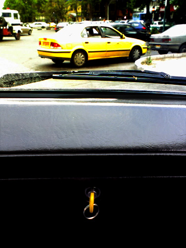 A yellow Samand taxi cab and the yellow key. Samand is Iran's "national car" and it's currently being exported to Belarus, Venezuela and Syria. But once they turned them into taxi cabs, it lost its appeal to Tehran's car buyers. |