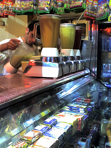 A "bartender" pouring me a cup of Cantaloupe Juice at a "juice bar." No one calls it that. It's my own invention. I figured with the absence of bars, and drinking juice being the only drinking one does in public, these are therefore "juice bars." "So... what're you doing later tonight? Wanna grab fruit juice?" |