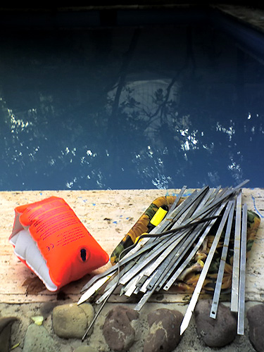 Remains of a ton of Kabob that was served at a pool party, where no one actually got in the pool except for someone's kids. Reminded me of the good old times by our pool back in the house on Laurel Canyon where we played silent Marco Polo and ate burgers and drank...[sigh]... beer! |